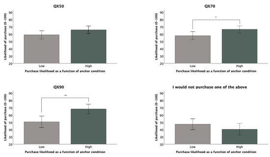 ηp2 = 0.070). After collapsing across HA knowledge groups to compare according to the anchoring condition alone, we saw that purchase likelihood was higher in the high anchor condition for the QX90 (
