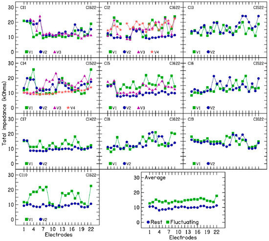 The clinical impedances were recorded using a pulse duration of 25 µs and pulse amplitude of 78 CLs or approximately 80 µA. Monopolar 1 + Monopolar 2 (MP1 +2) was the return electrode. The results show large changes in electrode impedances for the 10 CI patients across clinical visits. Figure 1 shows the clinical electrode impedances measured using Custom Sound Pro 6.0 clinical programming software for the 10 CI patients. The average impedance of electrodes that decreased after device rest was also plotted, alongside the average impedance of all other electrodes that exhibited fluctuating or increasing impedance across the 10 CI patients. Across 22 electrodes in 10 CI patients, electrode impedance changes ranged from 0.02 kΩ to 16.55 kΩ, with an average of 4.73 kΩ. In five patients (CI2, CI4, CI5, CI7, and CI10), the clinical electrode impedances lowered after 2 or 3 days of device rest. Lowered impedances were plotted at visit V2 for patients CI2, CI5, CI7, and CI10. For patient CI4, lowered impedances were plotted at visit V4. Figure 1 (Average panel) displays the average difference in electrode impedance between five post-device-rest measurements (CI2, CI4, CI5, CI7, CI10) and the overall average across all other measurements for the 10 CI patients. These findings suggest an inverse relationship between electrical stimulation and electrode impedance in the patients who were prescribed device rest. Impedance values decrease during device inactivity (rest) and increase with electrical stimulation [16], which is discussed further in the Discussion Section. The remaining five patients (CI1, CI3, CI6, CI8, and CI9) also showed large fluctuations in clinical electrode impedances. Device rest was not an option for these patients due to their reliance on the implant for daily listening. Given our clinical observations of device rest’s effectiveness in managing fluctuating impedance, it is reasonable to hypothesize that these patients would have exhibited reduced electrode impedances if device rest had been prescribed.