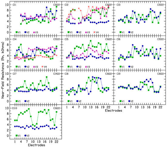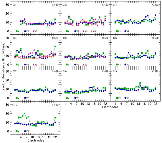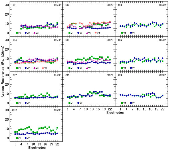 Electrode impedance measurements during different clinical visits for 10 cochlear implant patients with fluctuating electrode impedances. The abscissa shows electrodes, and the ordinate shows electrode impedance (kΩ).