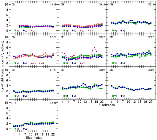 To investigate the nature of electrode impedance fluctuations, TIM measurements were performed during each clinical visit so that electrode impedances are broken down into constituent components. Figure 2 shows Ra (kΩ) as a function of the 22 intracochlear electrodes for the 10 CI patients. An average access resistance of 7.56 kΩ (SD = 1.86) was measured for the 10 CI patients across multiple clinical visits. Ra was broken down further into near-(Figure 3) and far-field resistance (Figure 4). An average near-field resistance of 5.13 kΩ (SD = 1.74) and far-field resistance of 2.42 kΩ (SD = 0.77) was computed for the 10 CI ears across 26 clinical visits. Visual inspection of the data and the standard deviation calculated show larger changes in near-field resistance contributing to changes in CI electrode impedances across clinical visits. These results are consistent with the notion that changes near the electrode contact area contribute to fluctuating or rising electrode impedances. The resistance of the return path to intracochlear or extracochlear ground (far-field resistance) demonstrated a minimal contribution to the observed increase in electrode impedances.