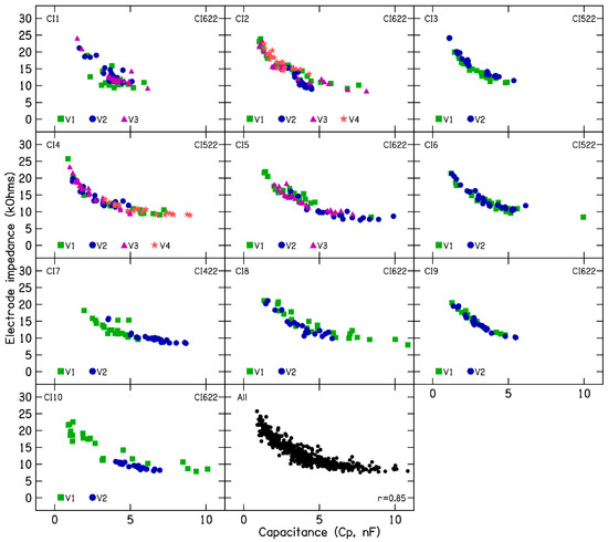 Warburg capacitance calculations in 10 CI patients with fluctuating or rising electrode impedances. The bottom middle panel includes calculations for all measured electrode impedances from these patients.