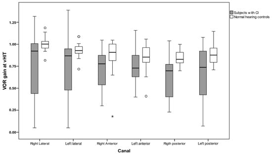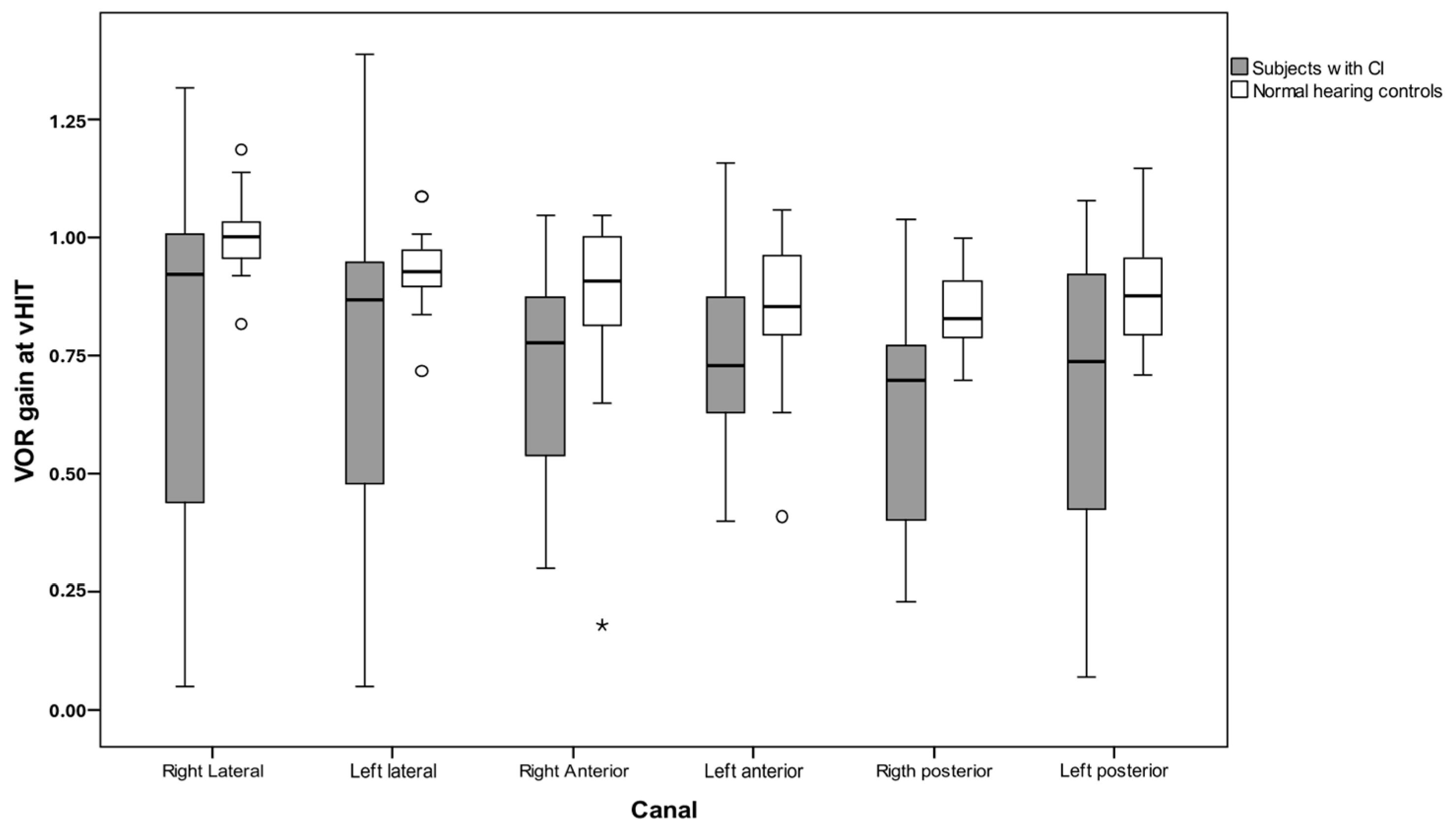 The VOR gain distribution of each canal in CI patients vs. NH controls is shown in Figure 1. Gain values in the implanted group were scattered in all tested canals compared to normal peers.