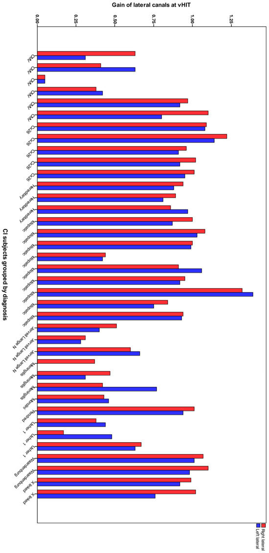 Lateral canal gain per ear and diagnosis in CI recipients.