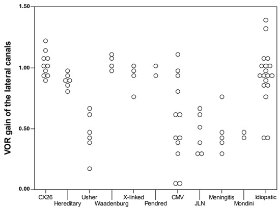 To determine whether the canal gain was statistically related to the cause of the hearing loss, we explored the distribution of lateral gain values of different diagnoses. CI ears with a background diagnosis of meningitis, Usher, and Jervell Lange-Nielsen syndrome (JLN) showed worse gain values, whereas patients with congenital cytomegalovirus (cCMV) infection presented variability from normal to complete canal failure (Figure 3).