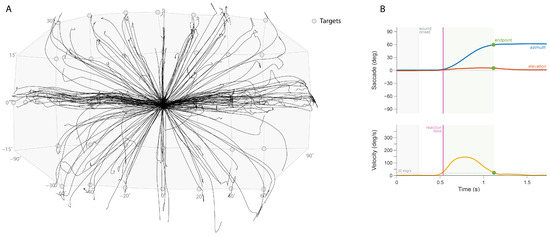 (A) Head trajectories for each trial (represented by line), localizing stimuli generated from the sound sources (represented by circles). (B) Example measurement of a subject’s head orientation and velocity for one trial.
