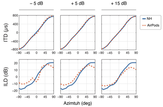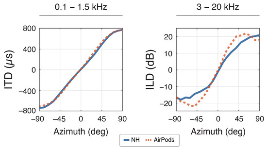 Analysis of the binaural cues derived from measured HRIRs revealed distinct patterns across device conditions in the horizontal plane (±90°; Figure 2). Under NH condition, ITDs showed the expected monotonic variation with azimuth, spanning the physiologically relevant range of ±700 µs. Due to the acoustic leakage in the low frequencies, the use of AirPods does not alter temporal relationships, demonstrating deviations from NH condition of less than 45 µs across all measured angles. In contrast, ILDs showed substantial alterations when measured through the AirPods compared to NH. The most pronounced deviations manifested as systematic amplification of the natural level differences, with maximum increases of 8.0 dB and 7.5 dB observed at −50° and 40° azimuth, respectively. This pattern of ILD enhancement diminished near the median plane, where differences between conditions were constrained to 0.5–2.0 dB, suggesting a spatial dependence in the device’s impact on interaural intensity cues.