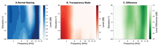 Recent acoustic measurements of commercial hearables’ transparency features have revealed substantial deviations from natural sound transmission characteristics, showing significant alterations in both monaural and binaural cues [20,21]. The deviations from natural hearing included processing delays ranging from 0 to 9.7 ms, with some devices showing left-right channel asymmetries up to 9.5 ms, and frequency response deviations of up to 15 dB relative to the open-ear configuration. While some devices maintained better acoustic transparency than others, significant compromises in frequency response accuracy and spatial cue preservation were evident in all studies, highlighting the technical challenges in achieving natural sound transmission through hearables. While these acoustic measurements provide crucial insights into signal modification, complementary perceptual studies have examined user experience through sound quality ratings assessments, demonstrating variable outcomes across different device implementations and listening scenarios [22]. However, despite extensive objective measurements, the extent to which these acoustic alterations translate to real-world localization deficits, particularly in the presence of environmental noise, remains unclear. Recent work by Watanabe and Terada (2023) [11] provides important behavioral evidence on spatial hearing degradation when using transparency mode for some of the available commercial hearables, demonstrating a significant decline in horizontal sound localization accuracy from 91.5% (open ear) to 68.9% (device with transparency mode). Although this work provided important information on transparency mode’s impact on spatial hearing, its evaluation was limited to horizontal-plane localization under ideal acoustic conditions. Critical aspects of real-world listening such as elevation perception and the effects of background noise have yet to be explored.