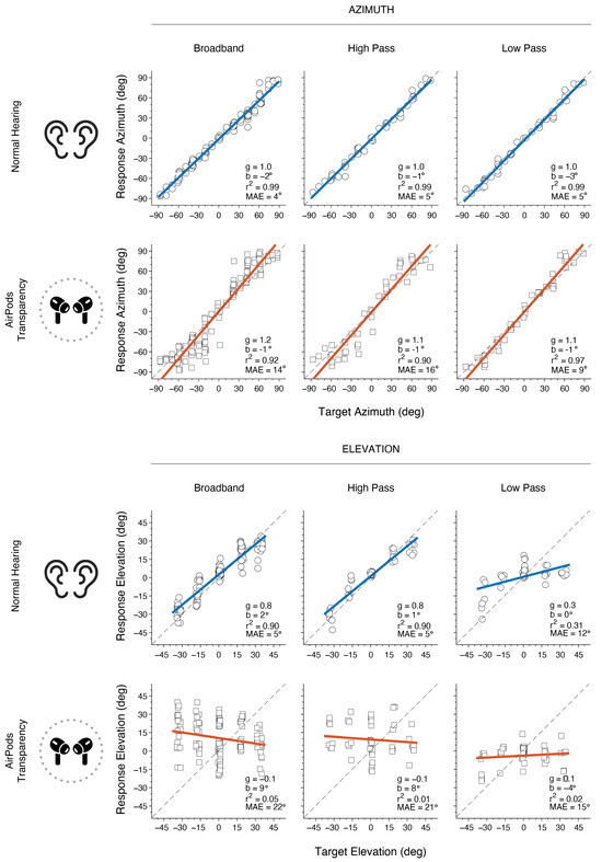 Sound localization performance was evaluated in quiet for BB (50, 60, and 70 dBA), LP (60 dBA), and HP (60 dBA) (see Methods). Figure 4 depicts an example of a participant’s sound localization results in each hearing condition. The listener accurately localizes horizontal sound sources in the NH condition, achieving gα values of 1, bα close to 0, r2α of ~1 and MAEα ≤ 5° across all stimuli. In the AirPods listening condition, azimuth responses are mostly accurate for the LP stimuli, yielding a bigger spread on the responses for BB and HP stimuli. In general, azimuth MAE with AirPods showed a bigger overall MAE than in the NH condition (≥9°), being the highest for BB and HP (14° and 16°, respectively). In elevation, the listener showed an expected normal-hearing outcome with target–response relationships for BB and HP, and with poor localization in LP due to lack of monaural spectral pinna cues in that frequency range. However, when examining the elevation responses with the AirPods, poor performance is observed across all stimuli. In this case, gains were practically 0, demonstrating the absence of a target–response relationship, together with large MAEs and low correlation values (i.e., big data spread).