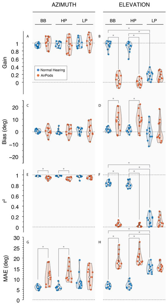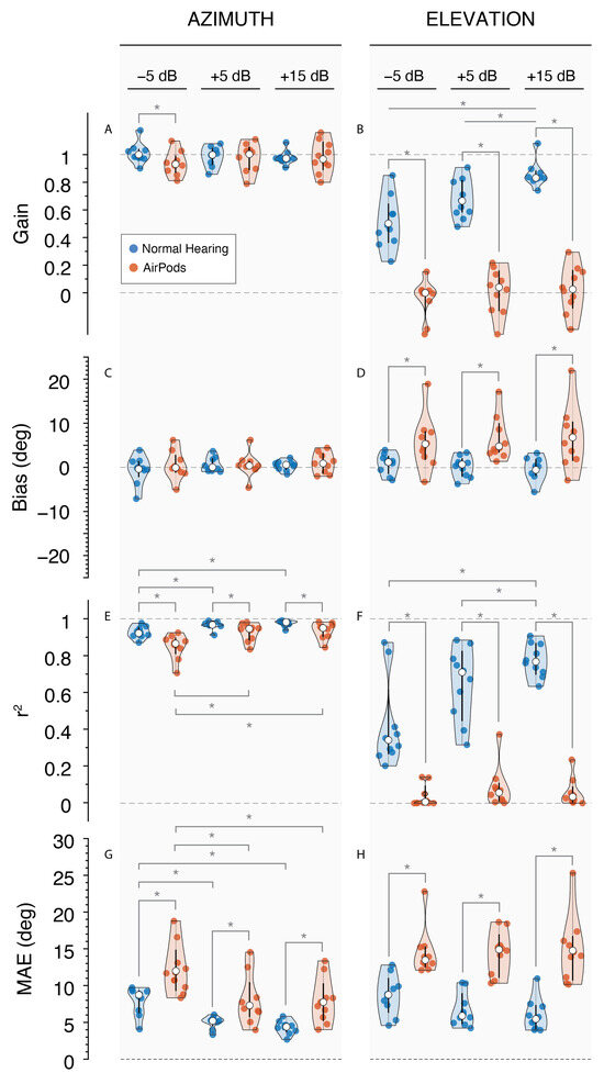 Violin plots presenting each participant’s performance (colored circles) for each stimulus, with the 25th and 75th percentiles indicated by the black bars and the median indicated by the white circle. Responses under NH conditions (blue) and AirPods (red). Left column: responses in azimuth for (A) Gain, (C) Bias, (E) r2, and (G) MAE; right column: responses in elevation for (B) Gain, (D) Bias, (F) r2, and (H) MAE. * indicates p-value < 0.05.