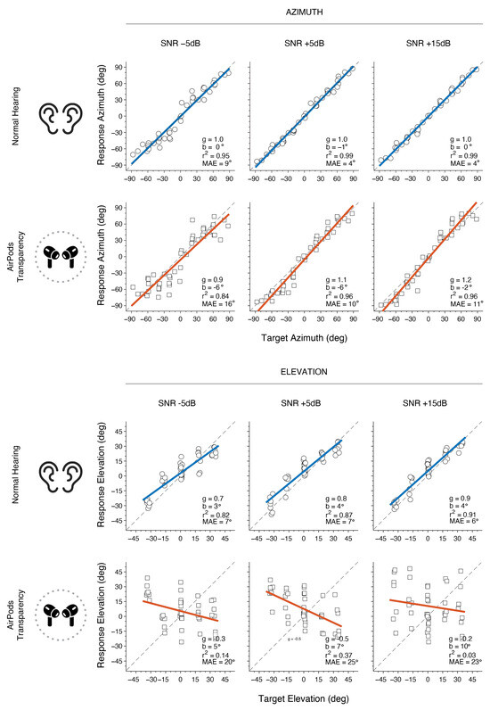 In Figure 7, the same participant as presented in Figure 4 is shown under different SNR conditions. For NH, the results indicate accurate azimuth localization for +5 dB and +15 dB SNR levels, while minor performance decrease is observed at −5 dB SNR, indicated by a decrease in r2α and an increase in MAEα. When using AirPods, MAEα increased by at least 6° overall when compared to the NH condition. Similar to NH, azimuth localization with AirPods was generally less accurate at lower SNRs, with a larger decrease of 0.12 in r2α and an increase of 6° in MAEα from +5 dB to −5 dB SNR. As expected, vertical localization in noise for NH was consistently lower in accuracy than for azimuth. Performance was relatively close to target values at +15 dB SNR but gradually declined as SNR decreased. With AirPods, localization accuracy in elevation was poor across all SNRs (−5, +5, and +15 dB), showing consistently low gain values, indicating a lack of a reliable target-response relationship. These results yield large MAEε and low r2ε values, demonstrating substantial variability and error in elevation localization.