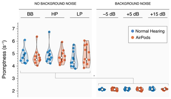 Violin plots showing response promptness for NH (red) and AirPods (blue) listening conditions during sound localization, both with and without background noise. * indicates p-value < 0.05.