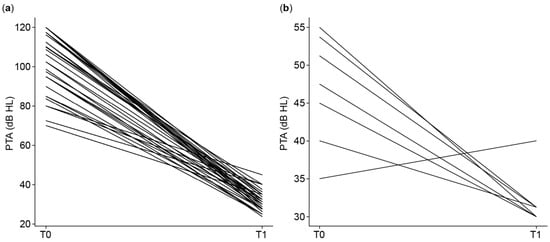 Figure 1a illustrates the individual evolution of PTA4 thresholds (poorer ear) from baseline (T0) to follow-up (T1 aided) after auditory implantation. The figure separates children and adults to provide a clearer view of hearing outcomes by age group. Each line represents one subject’s change in PTA4 thresholds, reflecting the degree of functional gain achieved. All patients showed substantial improvements in the aided condition (T1), with consistently lower PTA4 values compared to the unaided baseline. Figure 1b shows the evolution of PTA4 thresholds in the better ear for AHL subjects, measured at baseline (T0, unaided) and at follow-up (T1, in the best aided condition). At T1, most individuals were assessed while using a hearing aid in the better ear, except for one who was evaluated while unaided. These results underline the importance of optimal hearing aid fitting and regular use in patients with AHL undergoing auditory rehabilitation.