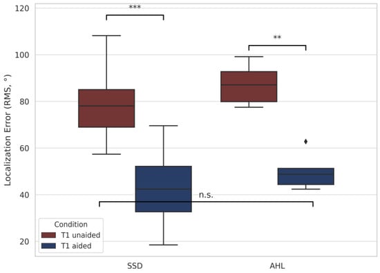 Boxplots of localization error (RMS, °) at follow-up unaided (T1), and with the device activated (T1 aided) in cochlear implant users with single-sided deafness (SSD) and asymmetric hearing loss (AHL). Outliers are represented by black diamonds (♦), defined as values outside 1.5 times the interquartile range Asterisks indicate statistical significance within or between groups (** p < 0.01, *** p < 0.001), “n.s.” indicates non-significant differences.