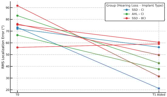 Localization accuracy was evaluated using the root mean square (RMS) error in degrees across three listening conditions: unaided baseline (T0), unaided follow-up (T1 unaided), and aided follow-up (T1 aided). The RMS value reflects the average angular deviation between the presented and perceived sound source locations, with lower values showing better spatial hearing.