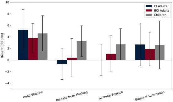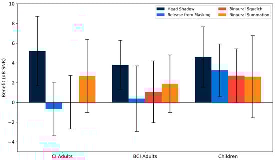 Binaural benefit patterns within groups. Bar plot showing the average improvement in speech reception threshold (SRT, in dB signal-to-noise ratio) for each of the four binaural effects—head shadow, release from masking, binaural squelch, and binaural summation—within each participant group: adults with CI, adults with BCI, and children. Each bar shows the mean benefit with standard deviation. The head shadow effect consistently appeared as the most prominent binaural advantage across all groups, as also confirmed statistically in the main cohort (p < 0.01).