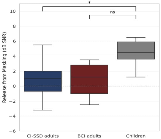 Statistical comparisons between groups (Figure 8) revealed that children performed significantly better than CI SSD adults for release from masking (t = 3.04, p = 0.007, d = 1.54). The difference with adult BCI users did not reach statistical significance (t = 2.10, p = 0.059, d = 1.14), although mean values remained higher in the pediatric cohort. While this finding may reflect an enhanced capacity to extract speech from spatially separated noise, it should be interpreted with consideration of the key clinical differences between groups. The pediatric group included both CI and BCI users, with either congenital/perilingual or acquired hearing loss. Nonetheless, due to earlier implantation, even children with congenital or early-onset deafness experienced significantly shorter durations of auditory deprivation compared to adults. In contrast, several adult BCI users had long-standing perilingual or postlingual deafness, potentially limiting the plasticity of their auditory pathways. These differences likely contributed to the observed advantage in pediatric performance.
