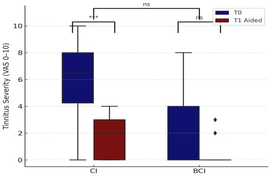 Tinnitus severity was measured in both CI and BCI subjects using a visual analog scale (VAS). A score of 10 indicated maximum disability, while 0 signified no tinnitus-related handicap.