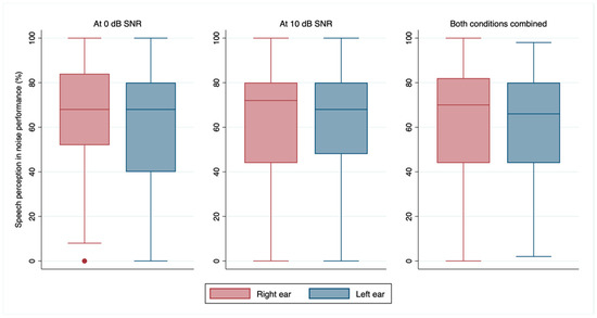 - Behtani, L.; Fuente, A.; Ianiszewski, A.; Al Osman, R.; Hickson, L. Right-ear advantage for unaided and aided speech perception in noise in older adults. J. Int. Adv. Otol. 2021, 17, 115–120. [Google Scholar] [CrossRef]