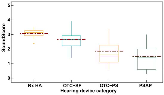 ScoundScore across hearing device categories (Rx HA = prescription hearing aids; OTC-SF = over-the counter self-fitting hearing aid; OTC-PS = over-the-counter pre-set hearing aid; PSAP = personal sound amplification system). Statistically significant differences in SoundScore were found between device categories. Reprinted from Manchaiah et al. [20].