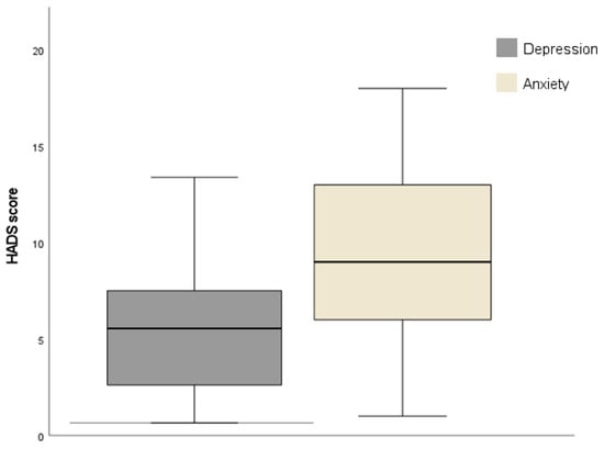 The mean HADS—anxiety scores were above the cut-off of the 8+ criterion for identifying cases of anxiety, indicating an anxiety prevalence of 62%, of whom 48.4% showed moderate symptoms. In detail, the distribution of the HADS—anxiety score was 9 (SD 4.63; range 1–18). On the other hand, on the depression subscale, a mean of 5.26 (SD 3.44; range 0–13) was obtained, as shown in Figure 1. Concerning depression subscale scores, participants exhibit fewer and less severe depressive symptoms, as can be observed in Table 2. Nonetheless, the results of Pearson’s correlation showed a moderate correlation with an increase in the HADS—anxiety scores and the HADS—depression scores (r = 0.608, p < 0.001).