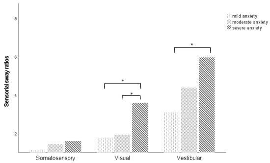 Moreover, individuals who showed severe symptoms of anxiety reported a higher postural sway velocity for all sensory ratios, especially for visual (mild vs. severe anxiety, p = 0.042; moderate vs. severe anxiety, p = 0.019) and vestibular ratios (mild vs. moderate anxiety, p = 0.071; mild vs. severe anxiety, p = 0.047), as shown in Figure 2.