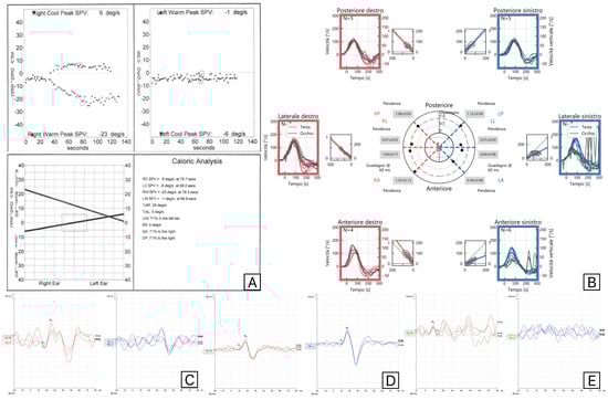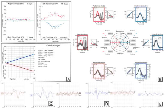 Results of vestibular tests (Caloric Tests (A), Video Head Impulse test (B), C-VEMPs (C), M-VEMPs (D), and O-VEMPs (E)) performed on a patient with a Herpes Zoster reactivation involving the right superior vestibular nerve and trigeminal nerves. Red is used for right-side evaluations and blue for left-side evaluations.