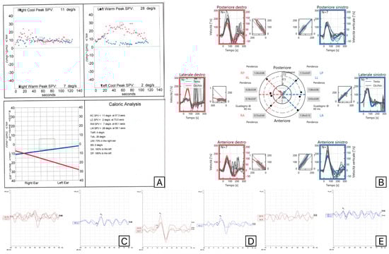 Results of vestibular tests (Caloric Tests (A), Video Head Impulse test (B), C-VEMPs (C), M-VEMPs (D), and O-VEMPs (E)) in a patient who showed a right supero-inferior VN, with normal M-VEMPs and abnormal responses at the Video Head Impulse Test in Posterior Semicircular Canal and absent C-VEMPs. Red is used for right-side evaluations and blue for left-side evaluations.