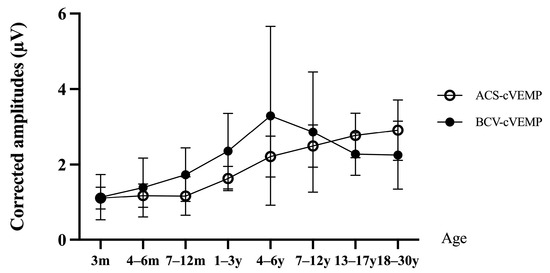Corrected amplitudes of ACS-cVEMP and BCV-cVEMP among different age groups with normal hearing. Open circles represent corrected amplitudes of ACS-cVEMP. Solid black circles represent corrected amplitudes of BCV-cVEMP. In normal hearing individuals across different age groups, the corrected amplitudes of ACS-cVEMP gradually increase with age, while BCV-cVEMP corrected amplitudes initially increase with age, peak at ages of 4–6 years old, and then gradually decrease with older age.