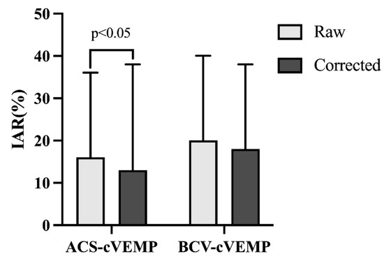 There were significant differences in the raw and corrected IARs of ACS-cVEMP. Corrected IARs were significantly lower than raw IARs (p = 0.001), while BCV-cVEMP IARs remained stable before and after correction (p = 0.452), as shown in Figure 4.