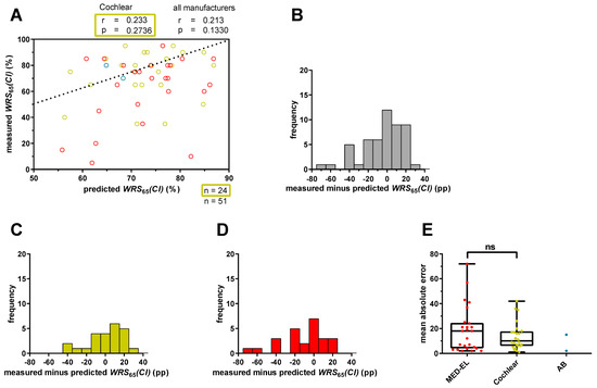 Prediction error for word recognition score at 65 dB with CI (WRS65(CI)) for patients with a four-frequency pure tone average (4FPTA) ≤ 80 dB HL. (A) The x-axis represents the predicted WRS65(CI), calculated with Equation (1), and the y-axis represents the measured WRS65(CI) after at least 12 months. The different colors represent different CI manufacturers (red: MED-EL; yellow: Cochlear; blue: Advanced Bionics (AB). The ideal fit between model predictions and measured values is indicated by the bisecting line. A deviation exceeding 20 percentage points indicates an inaccuracy in the prediction that has a relevant impact on patient counseling or expectation management. (B) The range of the prediction error for all patients (n = 51) was calculated by subtracting the predicted score from the measured score. Negative scores mean that the patients’ scores were below prediction and positive scores mean that the patients scored above prediction. (C) The range of the prediction error for only Cochlear™ recipients (n = 24) with a 4FPTA ≤ 80 dB HL. (D) The range of the prediction error for only MED-EL™ recipients (n = 25) with a 4FPTA ≤ 80 dB HL. (E) The mean absolute error for MED-EL™ (red), Cochlear™ (yellow) and AB™ (blue) recipients. ns—not significant.