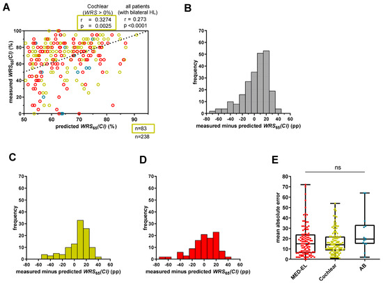 Prediction error for WRS65(CI) for all patients with bilateral hearing loss. (A) Predicted WRS65(CI), calculated with Equation (1), was plotted against measured WRS65(CI). The bisecting dotted line represents the ideal fit between model predictions and measured values. A deviation exceeding 20 percentage points indicates an inaccuracy in the prediction that has a relevant impact on patient counseling or expectation management. Red circles refer to MED-EL patients, yellow circles to Cochlear patients, and blue circles to AB patients. (B) The range of the difference between measured and predicted scores for all patients (n = 238). (C) The range of the prediction error for only Cochlear™ recipients (n = 113) with bilateral hearing loss. (D) The range of the prediction error for only MED-EL™ recipients (n = 111) with bilateral hearing loss. (E) The mean absolute error for MED-EL™ (red), Cochlear™ (yellow) and AB™ (blue) recipients. ns—not significant.