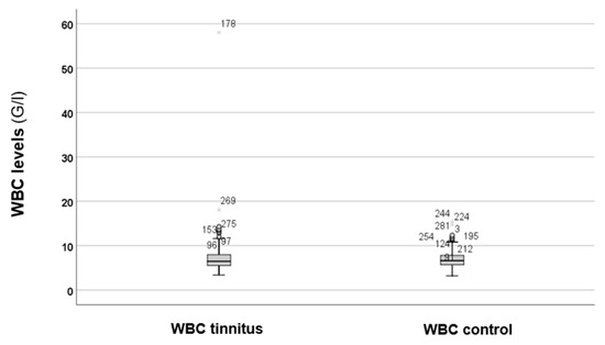 Total WBC levels between the tinnitus and the control groups. In the boxplots, the boxes indicate the interquartile range of the data, while the whiskers show the lower and upper quartiles. The black line that separates the boxes marks the median values. WBC = white blood cell; G = giga; l = litre. The asterisks, circles, and numbers in the figure depict the outliers.
