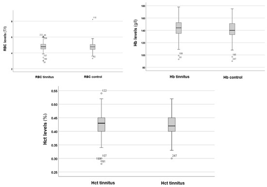 RBC, Hb, and Hct levels in the tinnitus and control groups. In the boxplots, the boxes indicate the interquartile range of the data, while the whiskers show the lower and upper quartiles. The black line that separates the boxes marks the median values. Hb = haemoglobin; Hct = haematocrit; l = litre; RBC = red blood cells; T = tera. The asterisk, circles and numbers in the figure denote the outliers.
