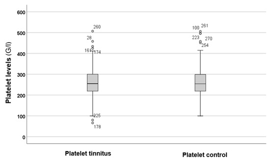 Figure 3 illustrates that there were no differences in platelet levels between the tinnitus and control groups. Statistical analysis using the Mann–Whitney U test (p = 0.782) indicated that there were no statistically significant differences between the parameters of the two groups.