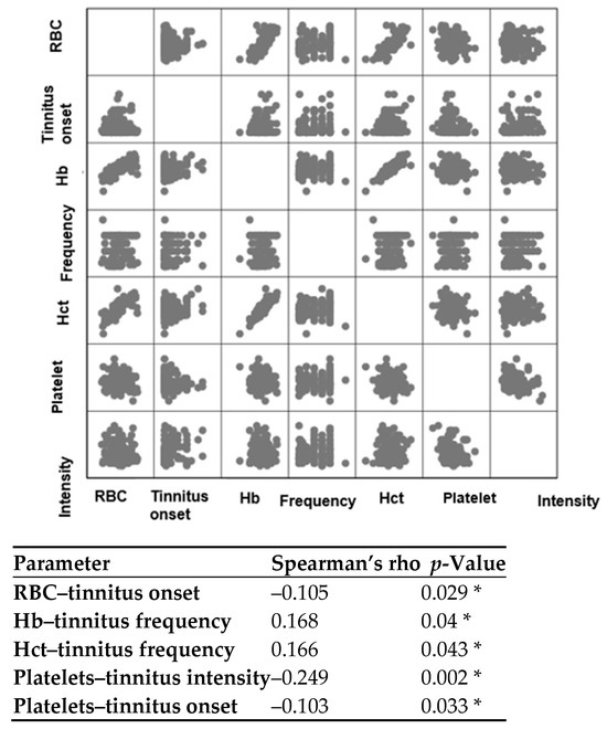 As depicted in Figure 4, a statistically significant (p = 0.029 *) negative (rho = –0.105) correlation was observed between RBC levels and the onset of tinnitus. This indicates that as the duration of tinnitus increases, the levels of RBC tend to decrease. In other words, anaemia may be a potential risk factor for experiencing more prolonged tinnitus symptoms. Tinnitus frequencies were significantly correlated with Hb (p = 0.04 *) and Hct (p = 0.043 *) levels, each showing positive correlations (rho = 0.168 and 0.166, respectively). Platelet levels displayed significant negative correlations with tinnitus intensities (rho = –0.249, p = 0.002 *) and the onset of tinnitus (rho = –0.103, p = 0.033 *). This suggests that lower levels of platelets may be associated with chronic tinnitus symptoms and greater tinnitus intensities. Pure-tone audiometry average values were correlated with each haematological parameter; however, since no significant correlations (p > 0.05) were observed, this analysis was not included in the correlation matrix.