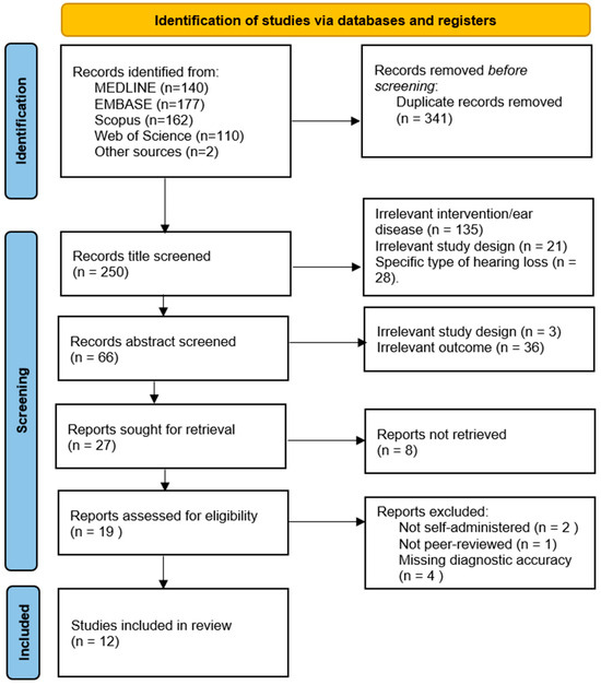 A total of 591 records were identified from four databases and other sources. After duplicate removal, 250 records were title screened. Based on title and abstract screening, 275 records were excluded, with 27 full-text reports to be retrieved and assessed for eligibility. Of these, 8 were unable to be retrieved as the full text was not freely available, leaving 19 reports to be assessed for eligibility. After a full-text review, 2 records were excluded for not being a self-administered application, 1 record was excluded for not being peer-reviewed, and 4 records were excluded for not including diagnostic accuracy metrics, which left 12 reports to be included in this review. The details of the search results are presented in Figure 1.