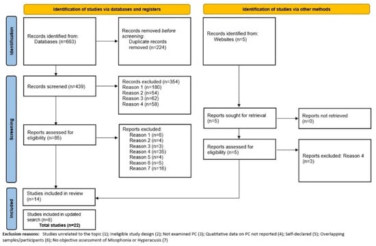 Systematic searches were conducted by first author (ALR) in cooperation with an academic librarian on the following four bibliographic databases—PubMed, PsycINFO, Scopus, and Web of Science (WoS). Searches were limited to human studies, and no date, language, or country origin restrictions were applied. The search strategy used the terms (Hyperacusis OR Misophonia OR Auditory hypersensitivity OR Auditory Sensitivity OR Noise Sensitivity OR sound sensitivity OR Sound Intolerance OR decreased sound tolerance OR aversive sound OR trigger sound OR Selective Sound Sensitivity Syndrome) AND (Psychiatric symptom OR Psychiatric comorbidity OR Psychiatric disorder OR Mental disorder OR Psychopathology OR Psychiatric Illness OR Mental Illness). A detailed search strategy is provided in Appendix A. To identify further relevant records, the gray literature was explored, and all studies included were subjected to backward and forward citation tracking by hand-searching reference lists and Google Scholar, respectively (initial search conducted on 7th January 2023 and updated search conducted on the 16th of April 2024).