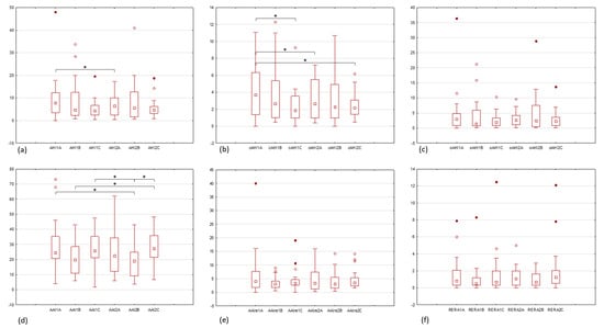 Statistics of recorded sleep parameters: (a) AHI, apnea-hypopnea index; (b) cAHI, central apnea-hypopnea index; (c) oAHI, obstructive apnea-hypopnea index; (d) AAI, autonomic arousal index; (e) AAIre, autonomic arousal index related to respiratory events; (f) RERA, respiratory effort-related arousal index; 1, first night, 2, second night measurement; A, Group A—acute idiopathic functional inner ear disease, B, Group B—chronic functional inner ear disease, C, Group C—healthy controls. box: 25–75%, whisker: non-outlier range, □ median, ° outliers, • extreme outliers, * p < 0.05.