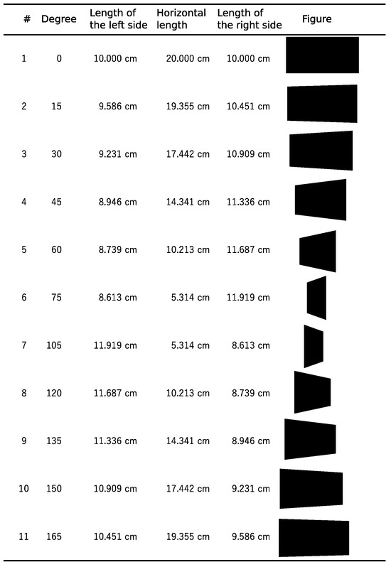 Figures used in the LBT. Figures presented in the LBT are rectangles and trapeziums, which are three-dimensionally equivalent to rectangles viewed from the side with specific degrees.