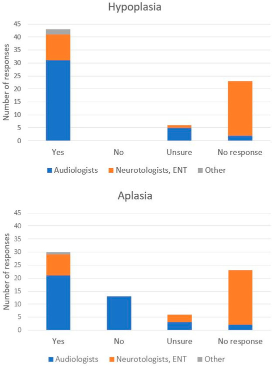Number of participant responses to the question (s) “Do you think there are instances where cochlear implantation is appropriate for a pediatric patient with 8th nerve _______?” with the blank space before the question mark referring to hypoplasia (top) or aplasia (bottom). Distribution of professional roles of participating health care professionals is marked by color within each bar.