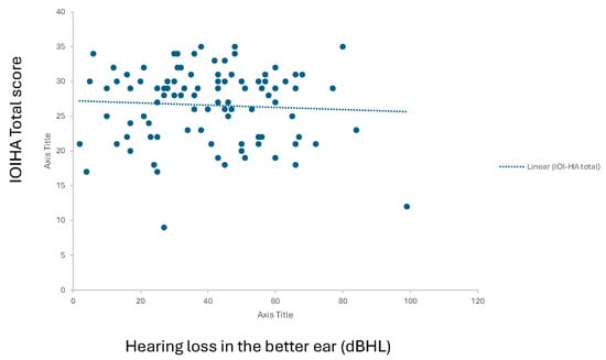 Simple linear regressions showed no association between IOI-HA total score and age (univariate least-squares regression, β = 0.05, t(98) = 0.55, p = 0.59) or hearing thresholds in the better-ear PTA (β = −0.04, t(98) = −0.59, p = 0.56) or the worse-ear PTA (β = −0.12, t(98) = −1.61, p = 0.11). Linear regression plotting for hearing loss in the better ear is presented in Figure 3.