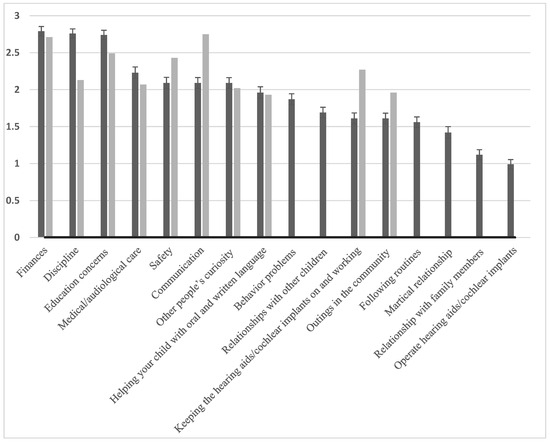 The highest-ranked stressors for Chinese caregivers were (1) financial, (2) discipline, (3) education concerns, (4) medical/audiological care, (5) safety, and (6) communication (see Table 2). Compared to English speakers [12], Mandarin speakers demonstrated more concerns about discipline, behavior problems, relationships with other children and fewer concerns about communication, keeping the hearing aids/cochlear implants on and working and outings in the community (Figure 2).