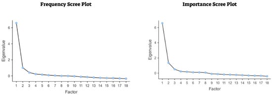 In addition, following previous validation efforts, EFA was conducted separately for the 18 frequency and 18 importance items to identify the underlying factors based on their relationships. We employed the principal axis factoring extraction method with a varimax rotation. The Kaiser–Meyer–Olkin (KMO) measure and Bartlett’s test of sphericity were used to assess the significance of the factor structures. A KMO value near one suggests adequate sampling, while items with factor loadings below 0.30 should be considered for removal. A p-value < 0.05 from the Bartlett test confirms sampling adequacy [35].