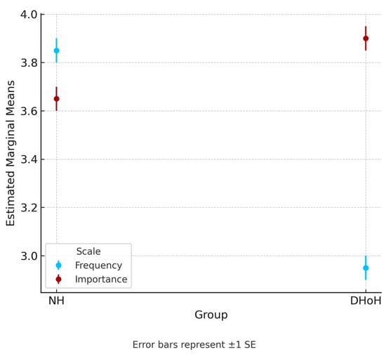 The NH group scored higher on the frequency scale, whereas the DHoH group scored higher on the importance scale, suggesting an interactive effect. We employed a two-way mixed-model ANCOVA to examine this interaction, controlling for age, sex, and education level. The between-group variable was “group” (NH/DHoH), and the within-group variable was “scale” (frequency/importance). As hypothesized, an interaction effect emerged, F (1, 305) = 137.346, p < 0.001, with a very strong effect size, ηp2 = 0.310 [36]. The analysis also indicated the main effects for the group, F (1, 305) = 15.275, p < 0.001, ηp2 = 0.048, and scale, F (1, 305) = 8.450, p = 0.004, ηp2 = 0.027.