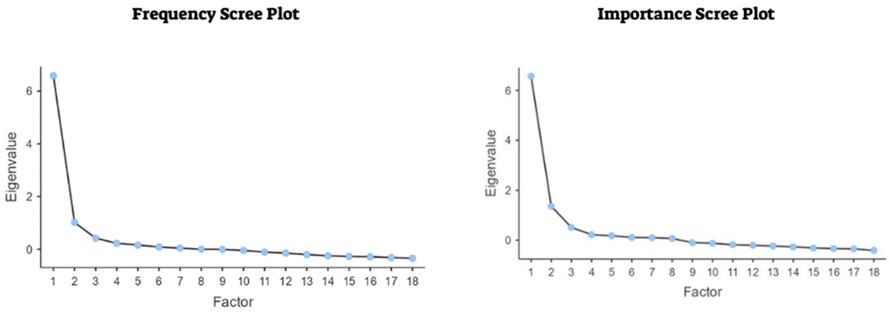 In addition, following previous validation efforts, EFA was conducted separately for the 18 frequency and 18 importance items to identify the underlying factors based on their relationships. We employed the principal axis factoring extraction method with a varimax rotation. The Kaiser–Meyer–Olkin (KMO) measure and Bartlett’s test of sphericity were used to assess the significance of the factor structures. A KMO value near one suggests adequate sampling, while items with factor loadings below 0.30 should be considered for removal. A
