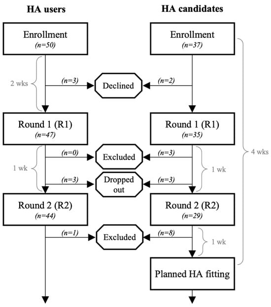 Study data were collected and managed using REDCap electronic data tools hosted at Region Hovedstaden [15]. Participants who decided to participate in the study were, as a starting point, registered in REDCap, and thereafter, a secure electronic mail was sent via e-Boks to participants to obtain informed consent digitally. Participants were then asked to fill out background information and then to fill out the questionnaires two times such that there were two data collection points timed approximately one week apart. For the HA candidate group, these two data collection points were timed individually so that they would occur just before it was planned that the participant would receive their HA. At the time of the planning of this study, participants were typically scheduled to return to the clinic to receive their HA 4 weeks after their initial consultation (Figure 1). In contrast, for the HA user group, these two data collection points were timed relative to the date of consent. The difference in the timing of these data collection points was important for the larger study to align the course of all assessments between the two groups, but the timing difference is less important in the current investigation. We will refer to these rounds of questionnaires going forward as Round 1 (R1) and Round 2 (R2).