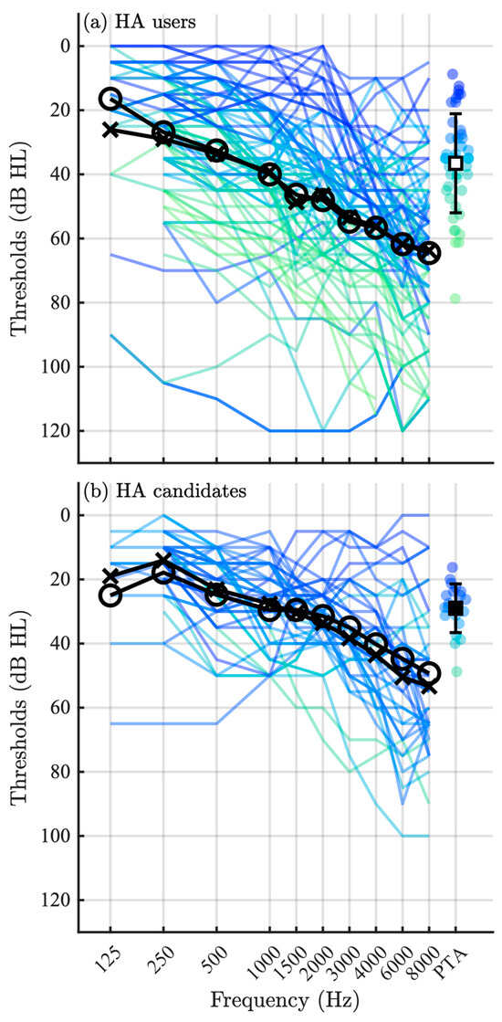 Audiograms for the (a) HA users and (b) HA candidate groups, where audiograms for both ears are shown in a single unique color (or gray tone) for each individual and the group means are shown in black. The black crosses indicate the group mean for the left ear, and the black circles indicate the group mean for the right ear. The better-ear pure-tone average (PTA) is shown for each individual on the right side of the figures, along with the mean and (SD) for the group.