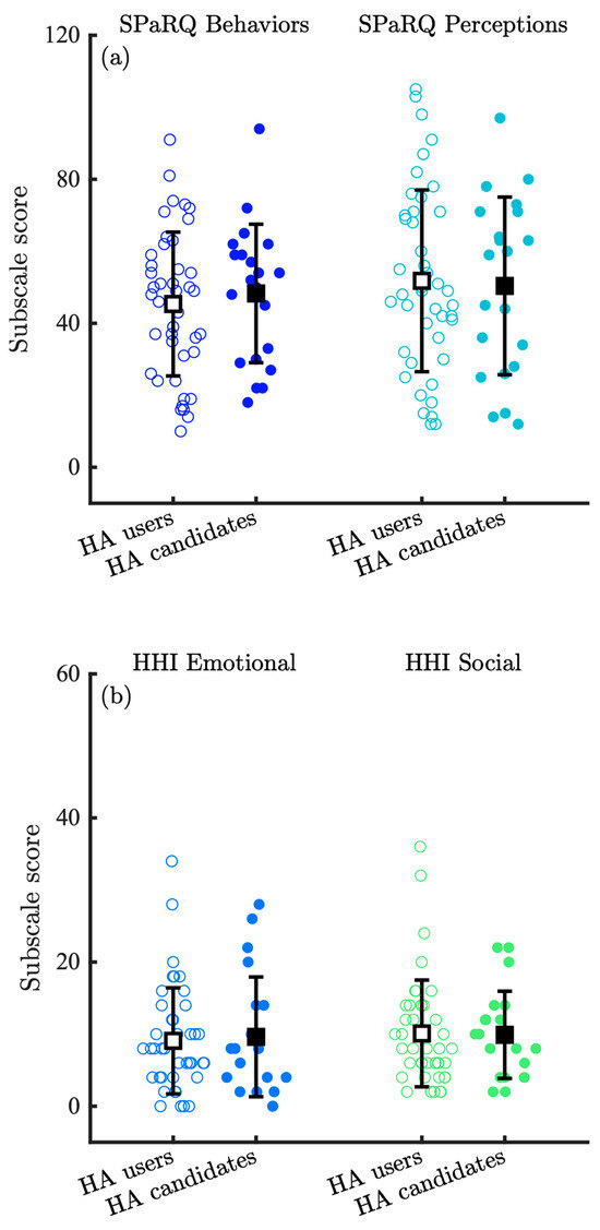 Distribution of (a) SPaRQ and (b) HHI responses at baseline (Round 1; R1) for the HA users and HA candidate groups, where individual data points are shown with colored circles, the means with black squares, and the standard deviation with black lines. Open circles and squares correspond to the HA user group, whereas filled circles and squares correspond to the HA candidate group.