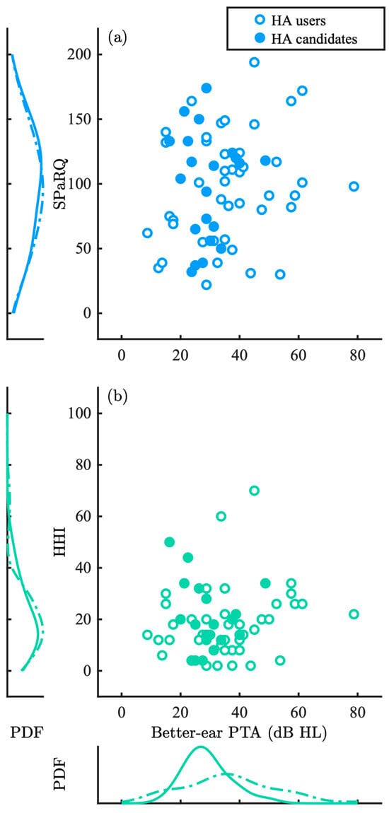 Combined (a) SPaRQ and (b) HHI scores in Round 1 (R1) as a function of better-ear PTA, where probability density functions (PDFs) for each group are estimated and shown along each axis. Individual data points are shown with open, blue circles for the HA users and filled, turquoise circles for the HA candidate groups, corresponding to dotted lines for the HA users and solid lines for the HA candidates.