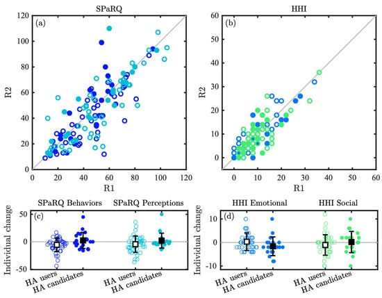 Test–retest analysis between Rounds 1 and 2 (R1 and R2), including scatter plots showing the raw scores of each subscale of the Danish (a) SPaRQ and (b) HHI questionnaires, as well as swarm charts depicting the distribution of the individual changes from R1 to R2 for each (c) SPaRQ and (d) HHI subscale. Individual data points are shown with open circles for the HA user group and filled circles for the HA candidate group, and the colors of the circles in (a,b) correspond to the respective colors used in (c,d) for each subscale. The group means are superimposed on top of the swarm charts in the black squares, and the standard deviations are shown with black lines.